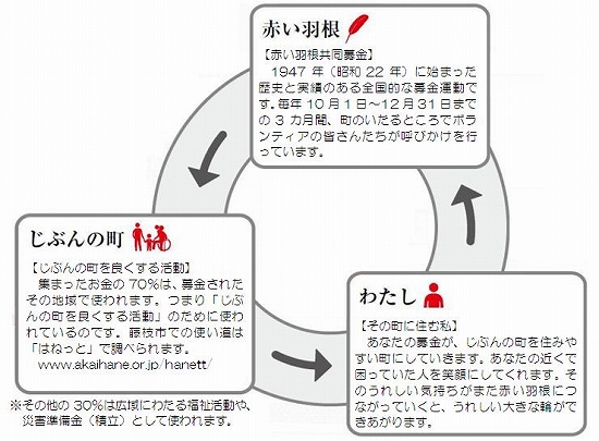 赤い羽根共同募金は、高齢者、障害者、子どもたちなどへの、地域の福祉活動を支援する募金です。集まったお金の約70%は、募金されたその地域で使われます。あなたの募金が、じぶんの町を住みやすい町に、あなたの近くで困っていた人を笑顔にしてくれます。